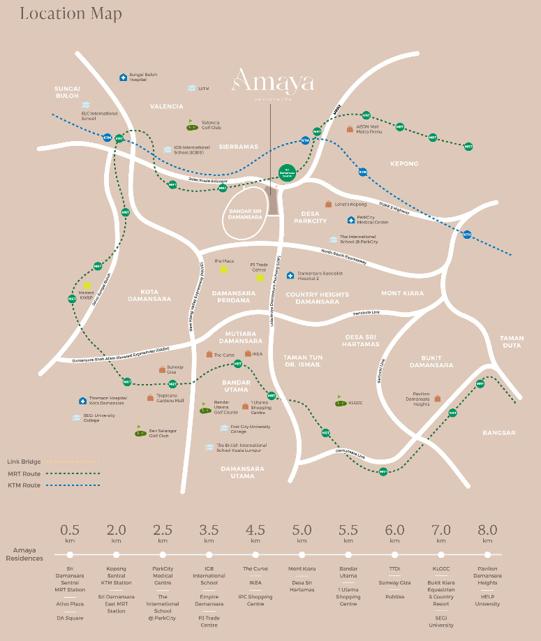 The residences are within walking distance to MRT Bandar Sri Damansara station and connected via major highways like LDP, NKVE, and DUKE, providing seamless access to Klang Valley, Kuala Lumpur, and surrounding areas.