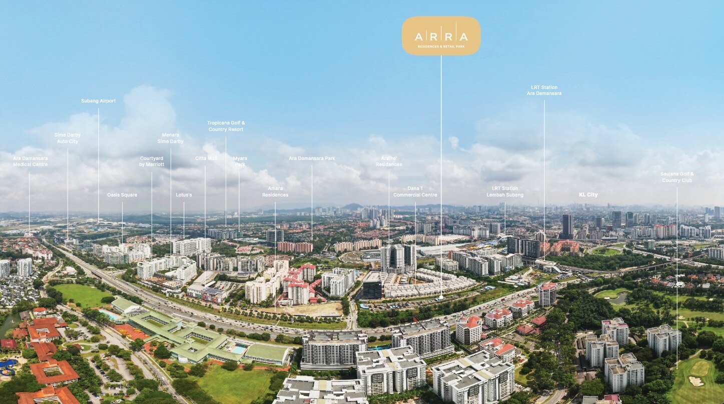 ARRA is located in Ara Damansara, Petaling Jaya, right next to LRT Ara Damansara station (Kelana Jaya Line). It also offers easy access to major highways like LDP, NKVE, ELITE, DASH, and Federal Highway, and is just minutes from Subang Airport, Citta Mall, Oasis Square, and Saujana Golf Course.
