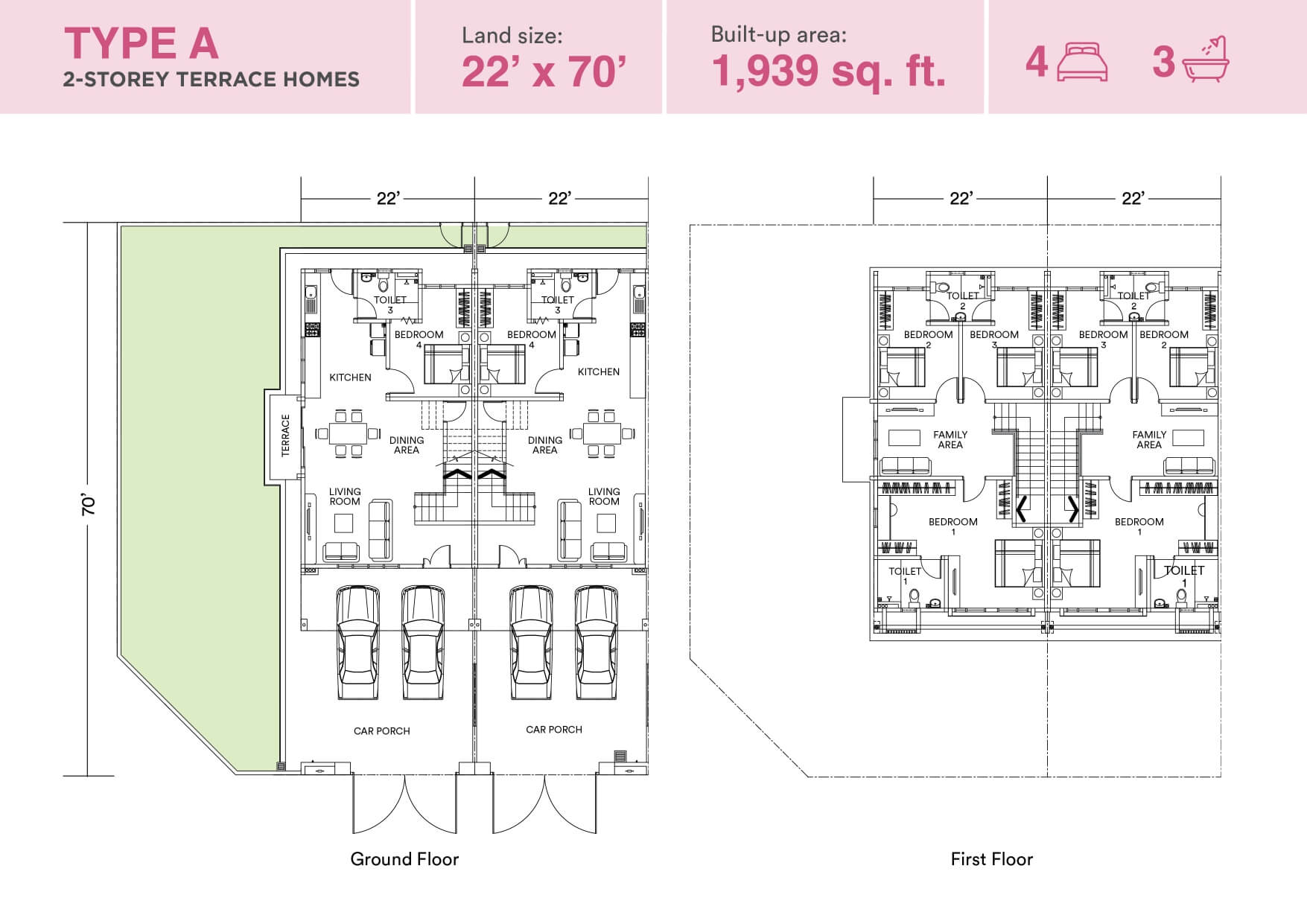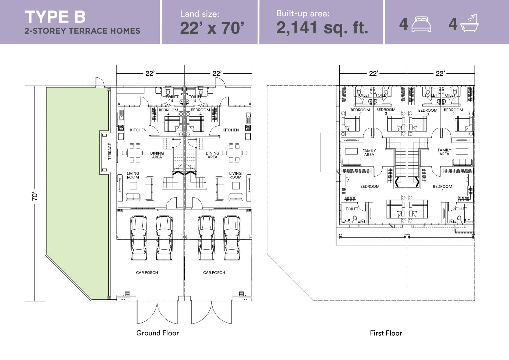 | Type A | 22′ X 70′ | 1,939 sq. ft. | 4B, 3B