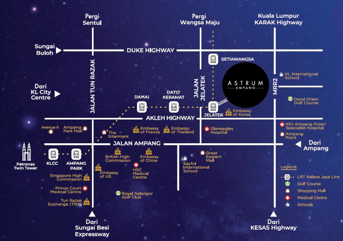 Astrum Ampang is strategically situated in Taman Keramat, just a stone's throw away from the Jelatek LRT Station. This Transit-Oriented Development (TOD) ensures effortless access to Kuala Lumpur’s key landmarks, including popular shopping destinations and reputable medical centres. The location’s excellent connectivity makes it a top choice for both urban professionals and families.