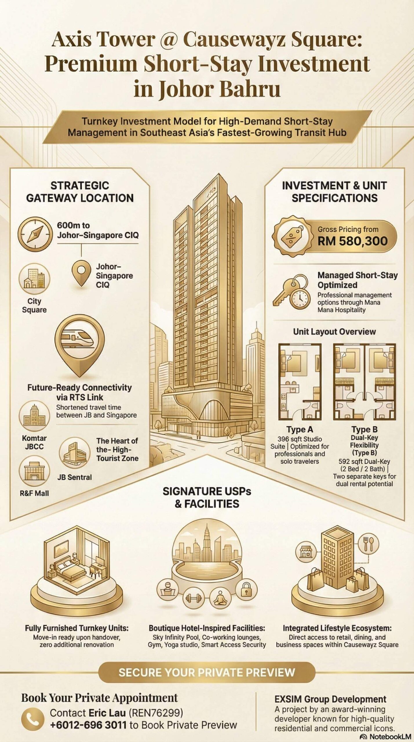 With fully furnished units, dual-key layouts, and a location just 600 meters from Johor–Singapore CIQ, Axis Tower offers investors a ready-to-operate property in one of Southeast Asia’s fastest-growing short-stay markets.