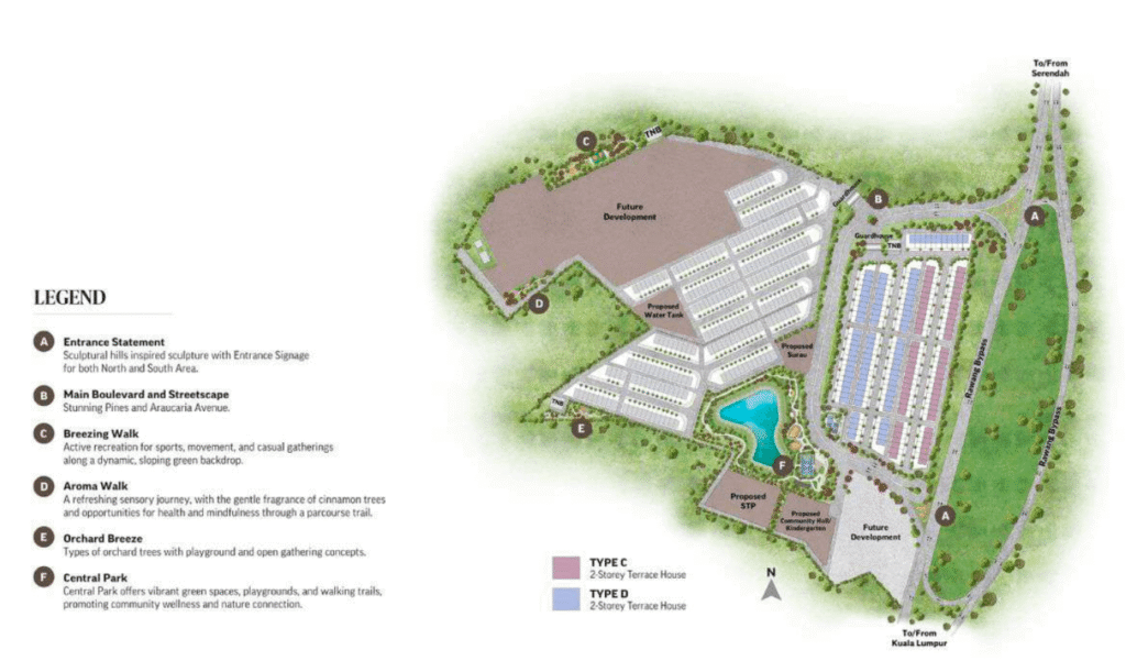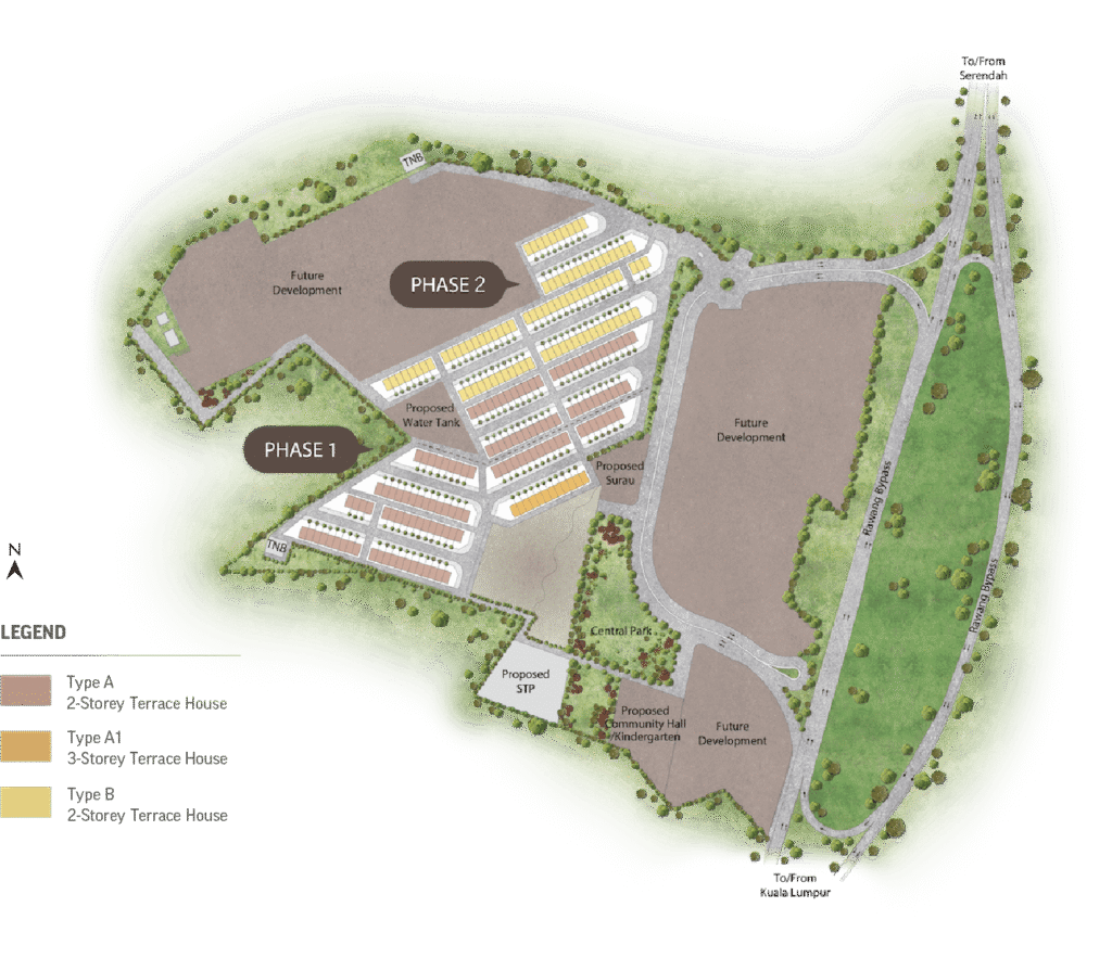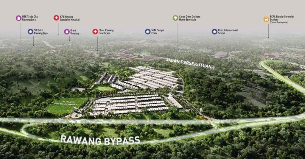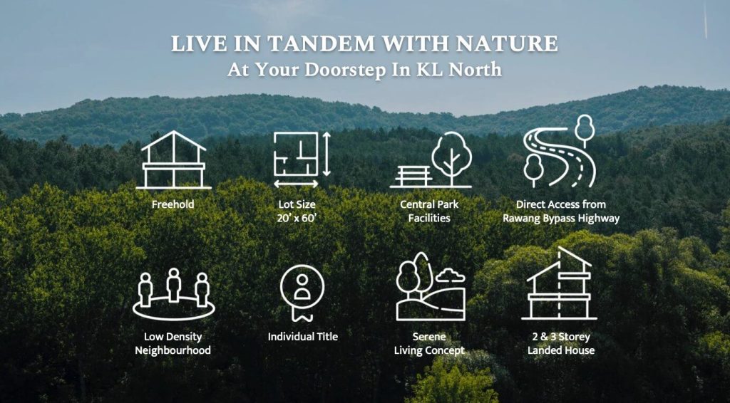 | Main USP | • Nature-inspired living next to forest reserve • Freehold, low-density landed homes in 55.72-acre township • Strong connectivity via Rawang Bypass, LATAR & PLUS |