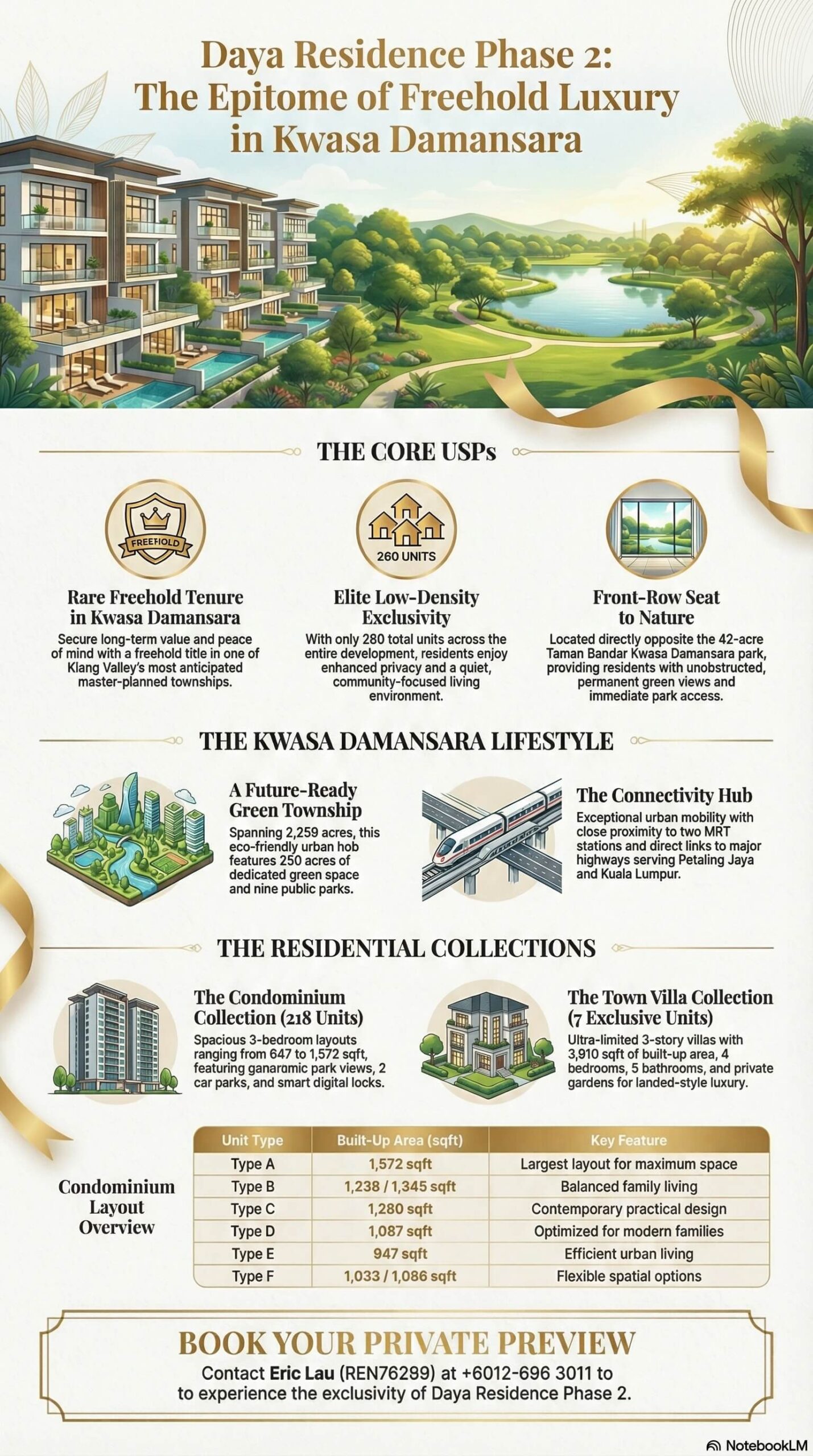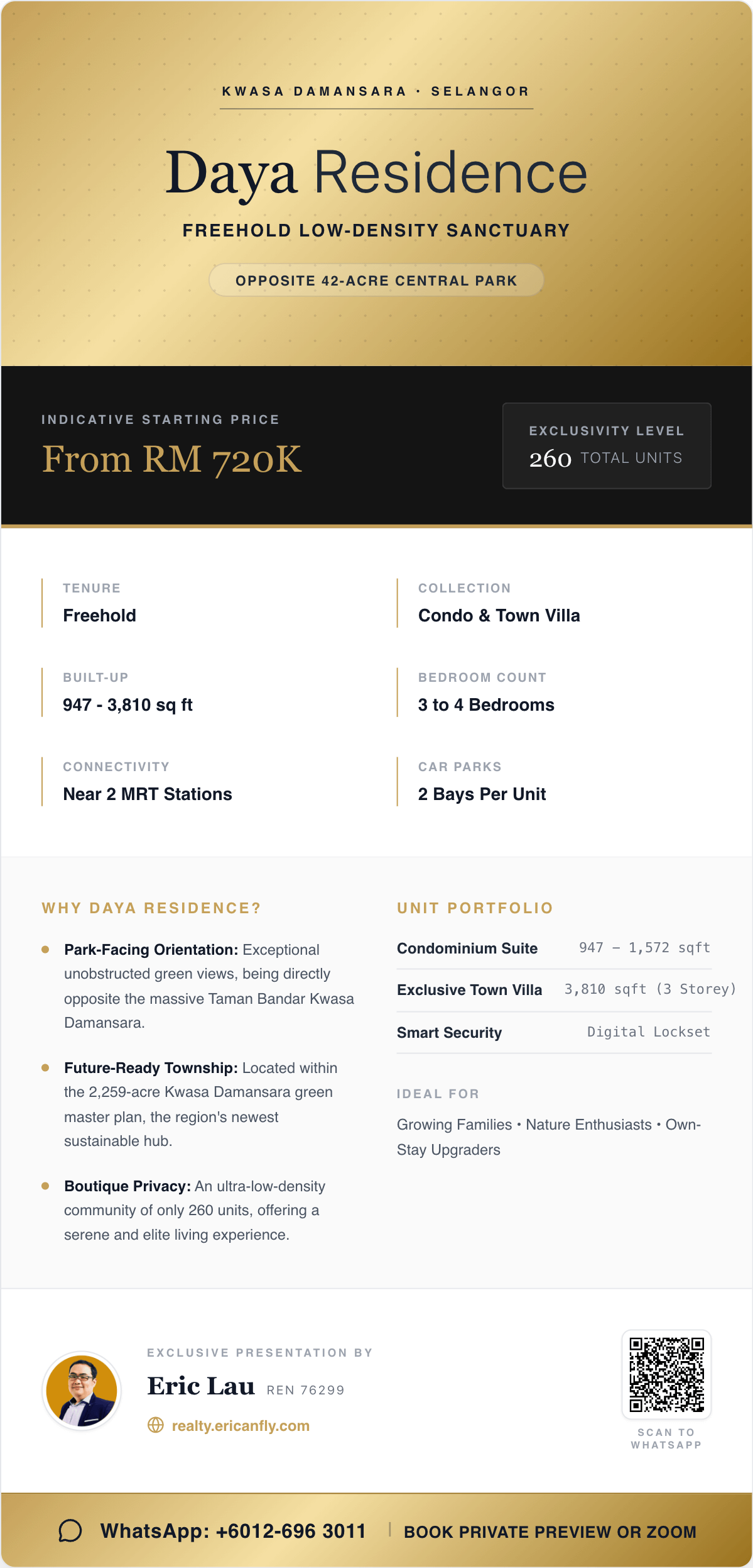 “Low-density freehold projects within Kwasa Damansara are increasingly limited. Daya Residence stands out because of its park-facing orientation, practical family-sized layouts, and exclusivity — especially the Town Villas, which are extremely limited in number.”