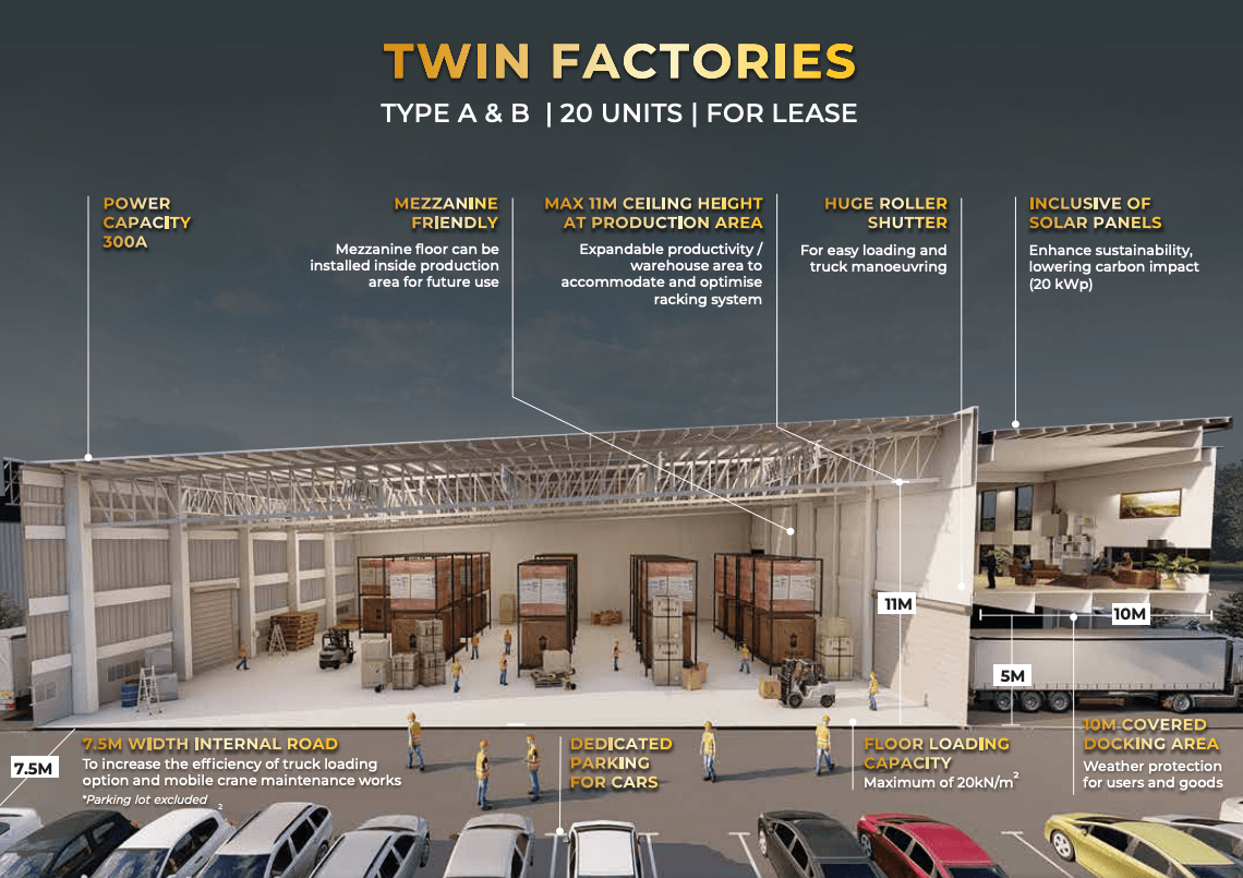 It offers freehold twin factories with modern specifications, 2-storey offices, wide truck access, and a rare option to purchase after the initial lease.