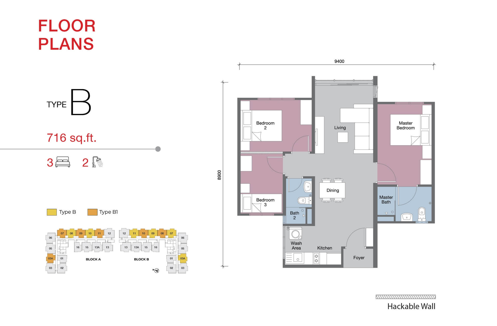 - Type B/B1 – 3R2B, 716 sqft, 1–2CP