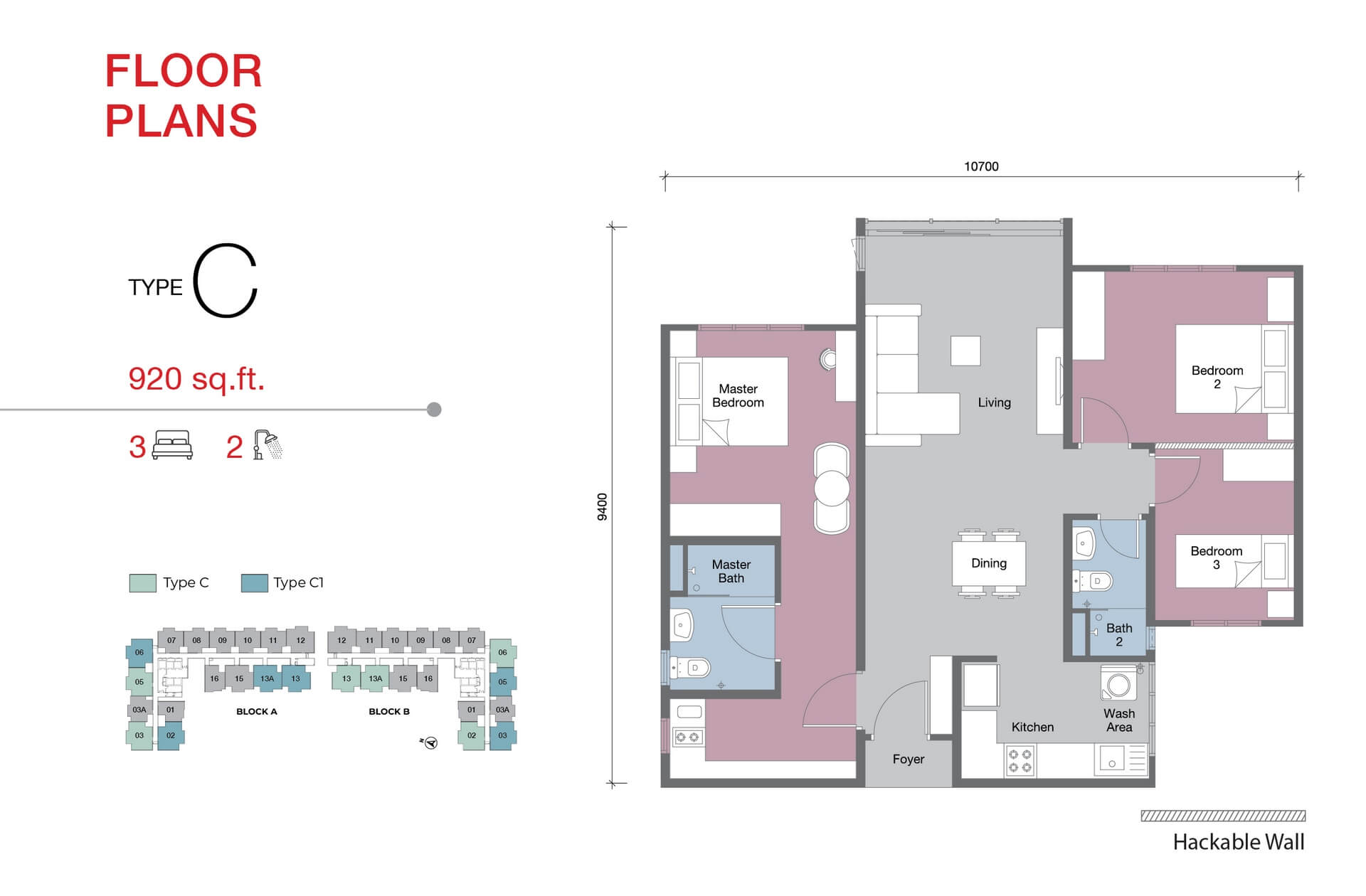 - Type C/C1 – 3R2B (Dual Key Convertible), 920 sqft, 2CP