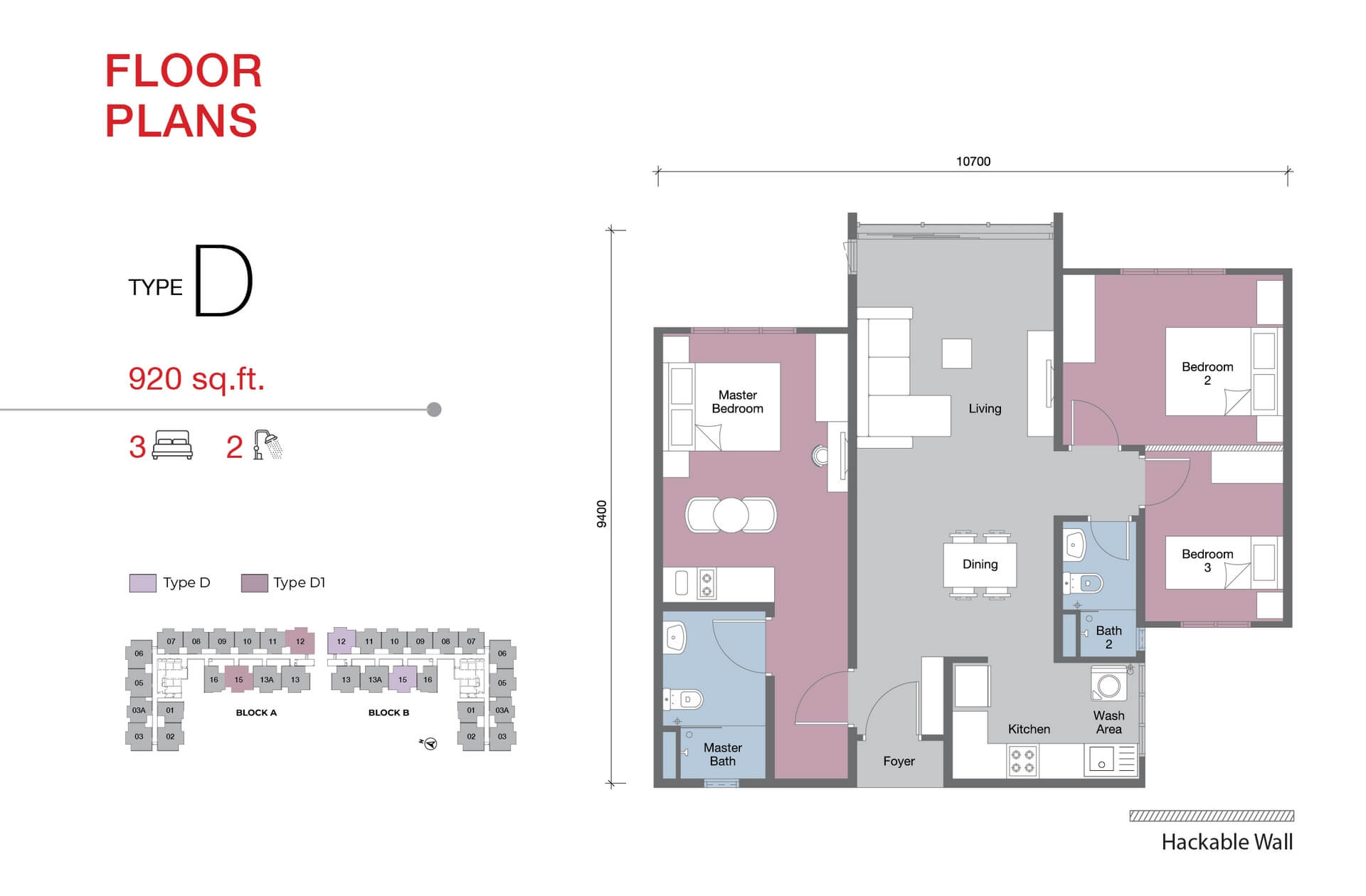 - Type D/D1 – 3R2B (Lavish Master Bedroom), 920 sqft, 2CP