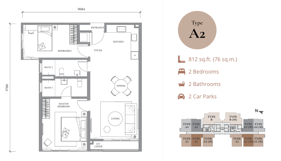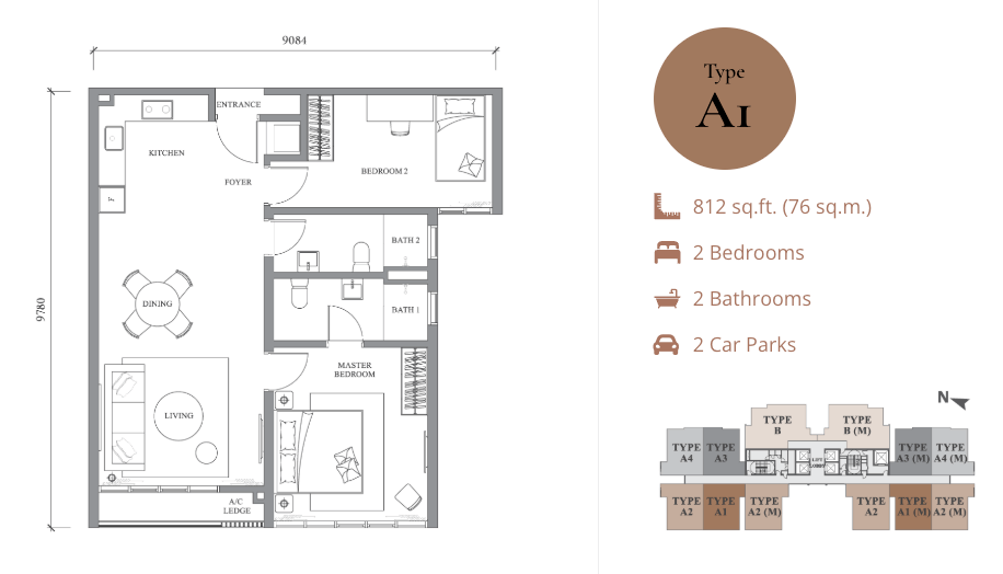 | Type A1 & A2 | 812 sq ft | 2 Bedrooms + 2 Bathrooms | From RM604,000 | Efficient layout, ideal for professionals |