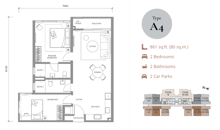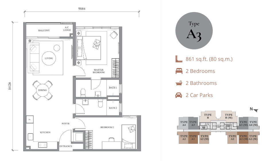 | Type A3 & A4 | 861 sq ft | 2 Bedrooms + 2 Bathrooms + Balcony | From RM652,000 | Compact home with open balcony |