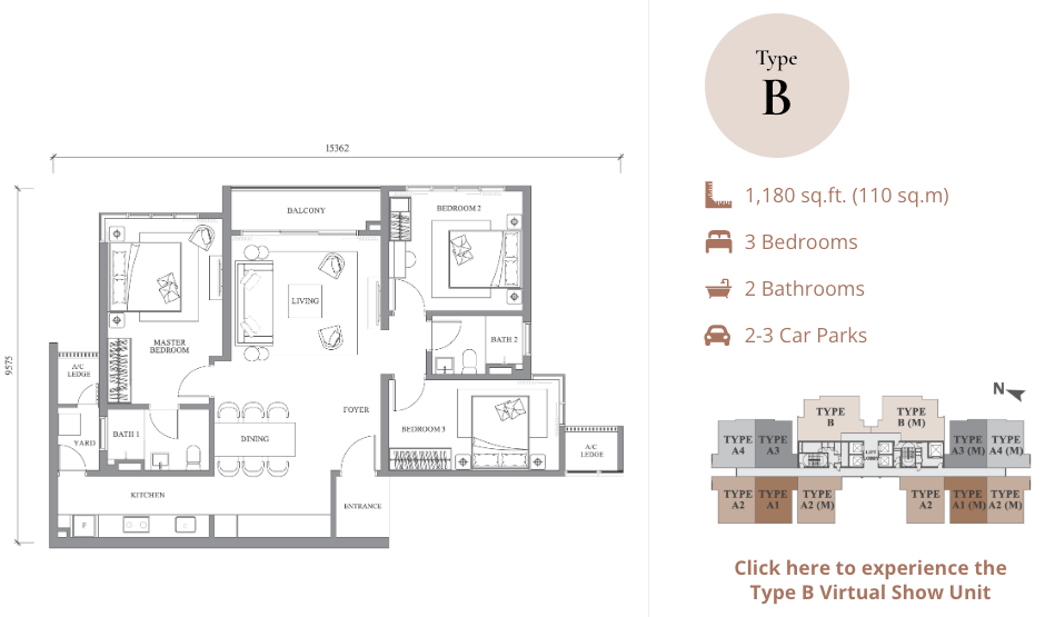 | Type B | 1,180 sq ft | 3 Bedrooms + 2 Bathrooms + Balcony | From RM947,000 | Family-sized layout with city view |