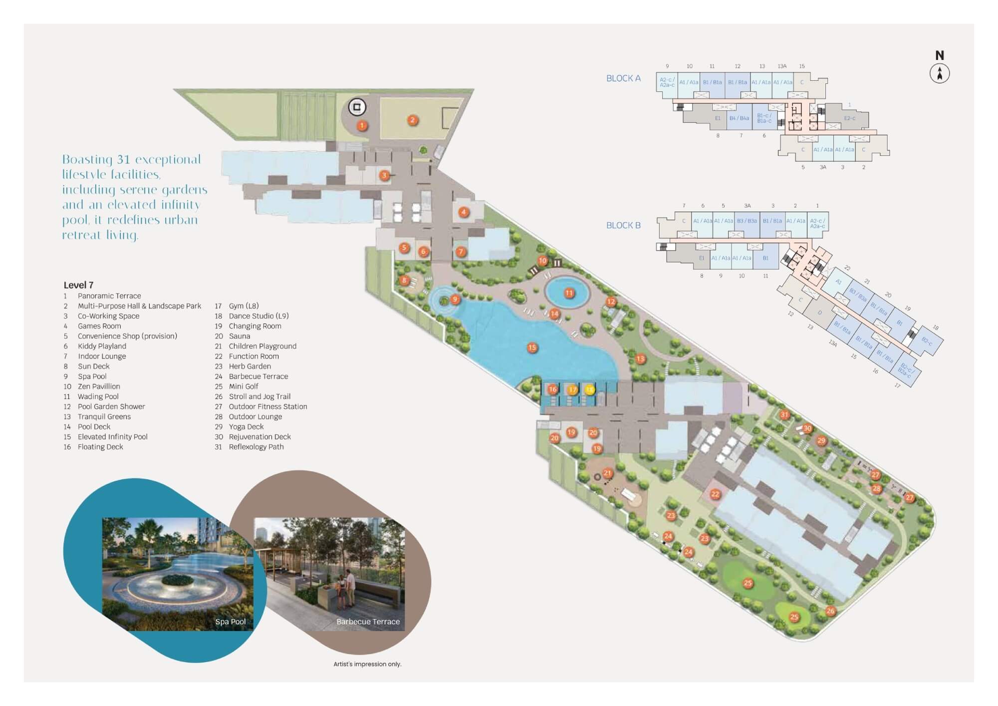 31 facilities, including an infinity pool, yoga deck, mini golf, 2-storey fitness studio, and lush green spaces, creating a tropical urban retreat.