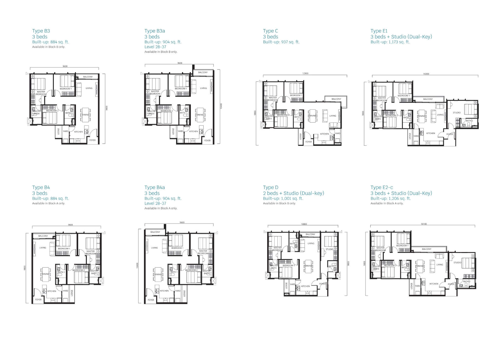 Units from 766 to 1,206 sq. ft. with 2–3 bedrooms, including dual-key options for multi-generational living or rental income, all with balconies and 2+ car parks.