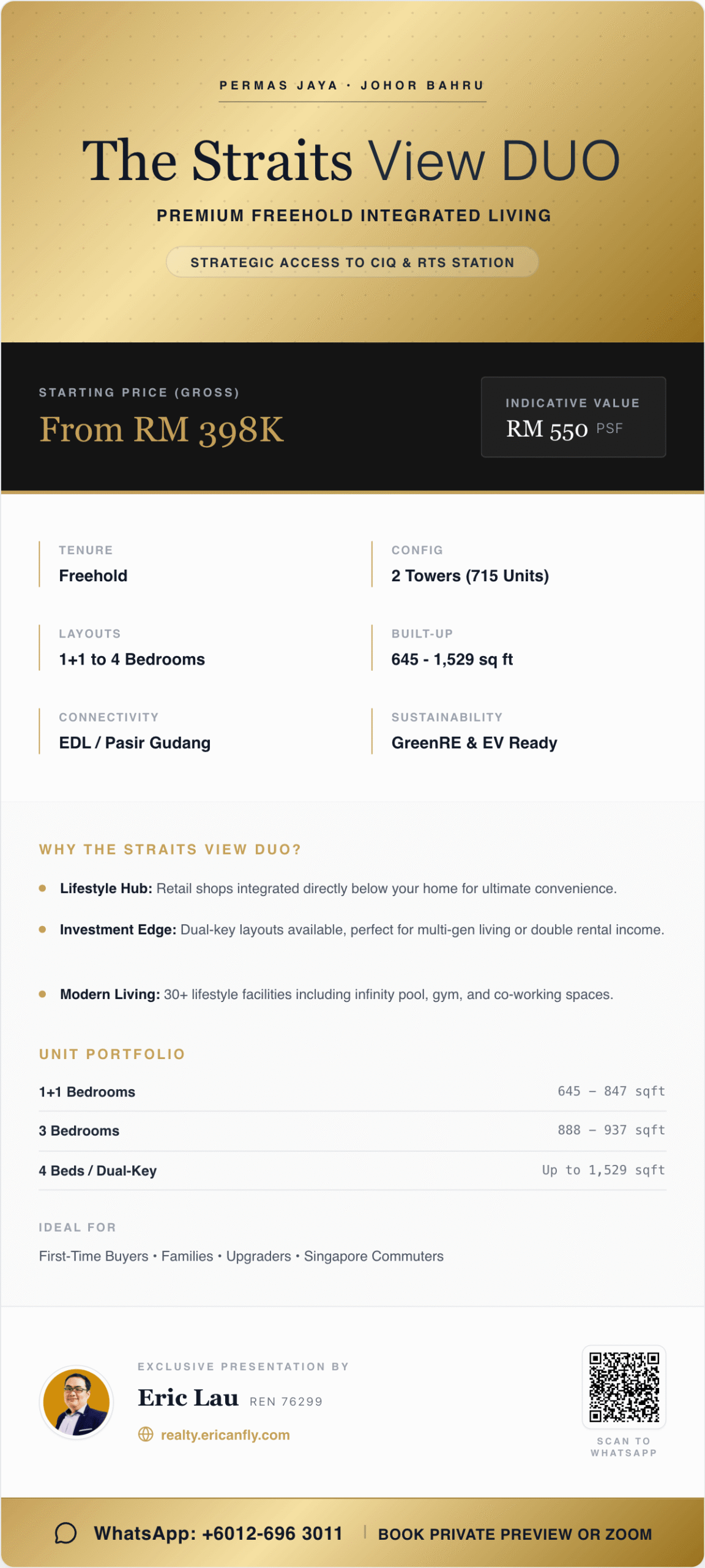 From a market standpoint, The Straits View DUO offers one of the lowest entry prices for freehold high-rise living in Permas Jaya, starting from around RM550 psf.