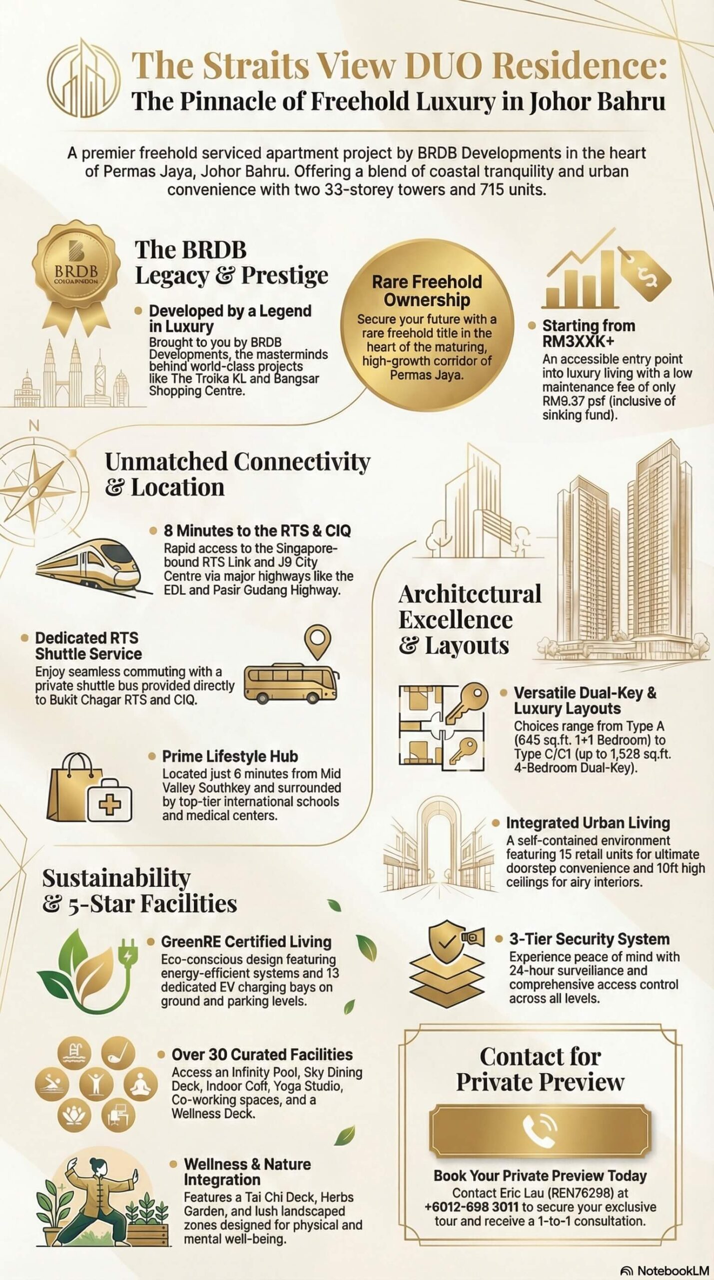Discover The Straits View DUO Residence, a landmark freehold serviced apartment by Permas Jaya Sdn. Bhd., a subsidiary of BRDB Developments — one of Malaysia’s most trusted property names.