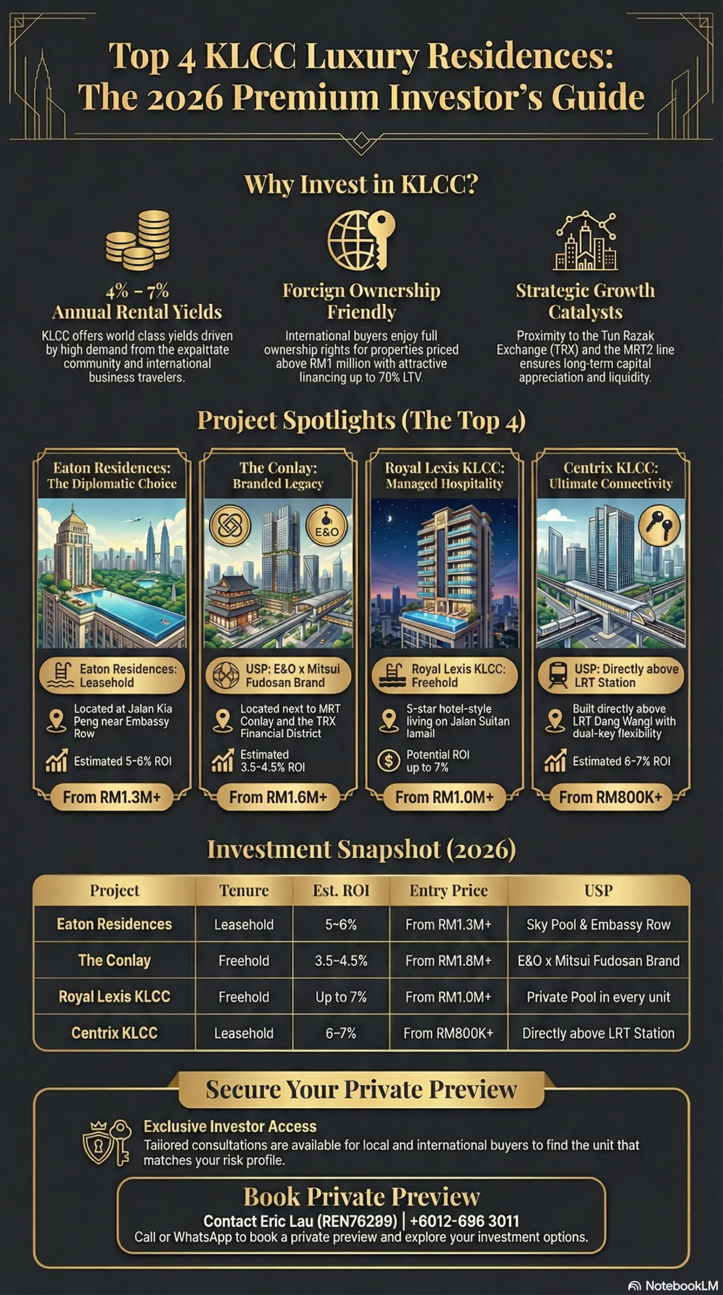 Each of these four KLCC developments represents a distinct investment profile — from steady corporate rental (Eaton Residences) to branded exclusivity (The Conlay), guaranteed hospitality income (Royal Lexis), and dual-key flexibility (Centrix KLCC).