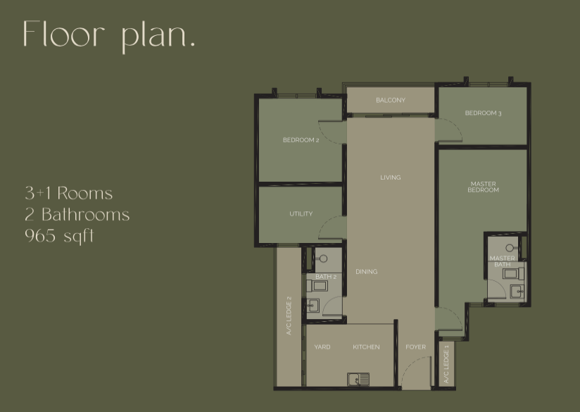 - Configurations include options for families, students, or professionals, with sizes starting from 965 sqft.